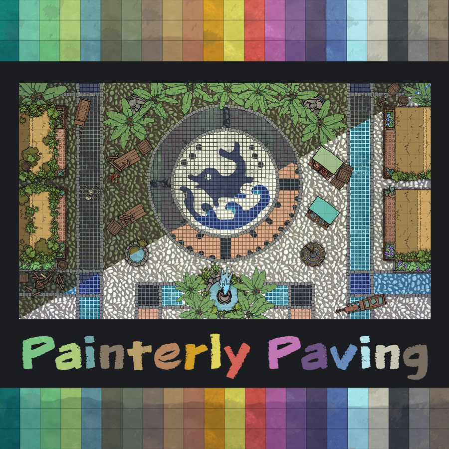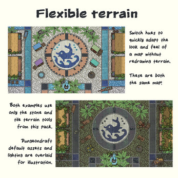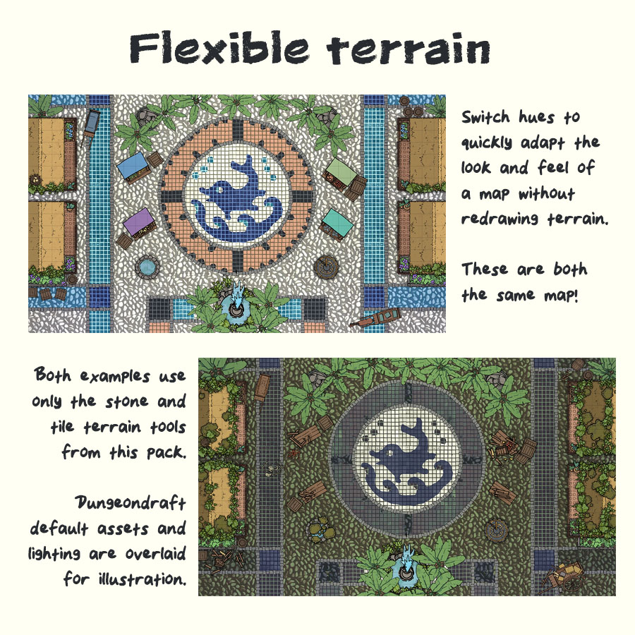 Simple stone and tile terrain for Dungeondraft. Each texture comes in 66 shades (light, mid and dark across 22 hues), designed to blend naturally for a painterly look.