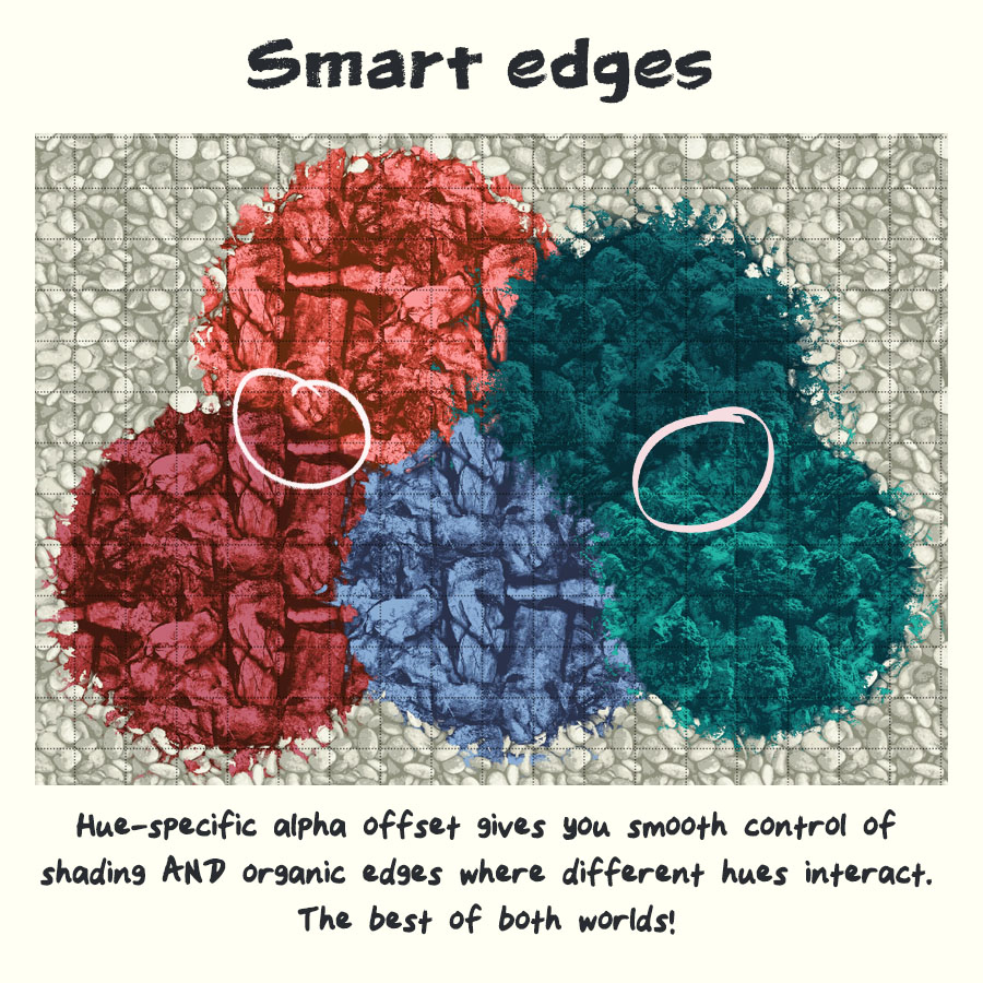Every pack in the Painterly set includes the same 22 colour options (20 simple hues + greyscale and ‘mossy’ green/brown) for a consistent and easy to coordinate palette. Each of the 22 colour options includes a light, medium and dark shade of the same hue.